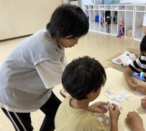 これまでの準備の際、部屋をふらふらする姿が見られた子も、実際に動いたことで、自分の役割をしっかり理解することができたようで、意欲的に意見を出し、おもてなしの準備に取り組む事ができるようになっています。