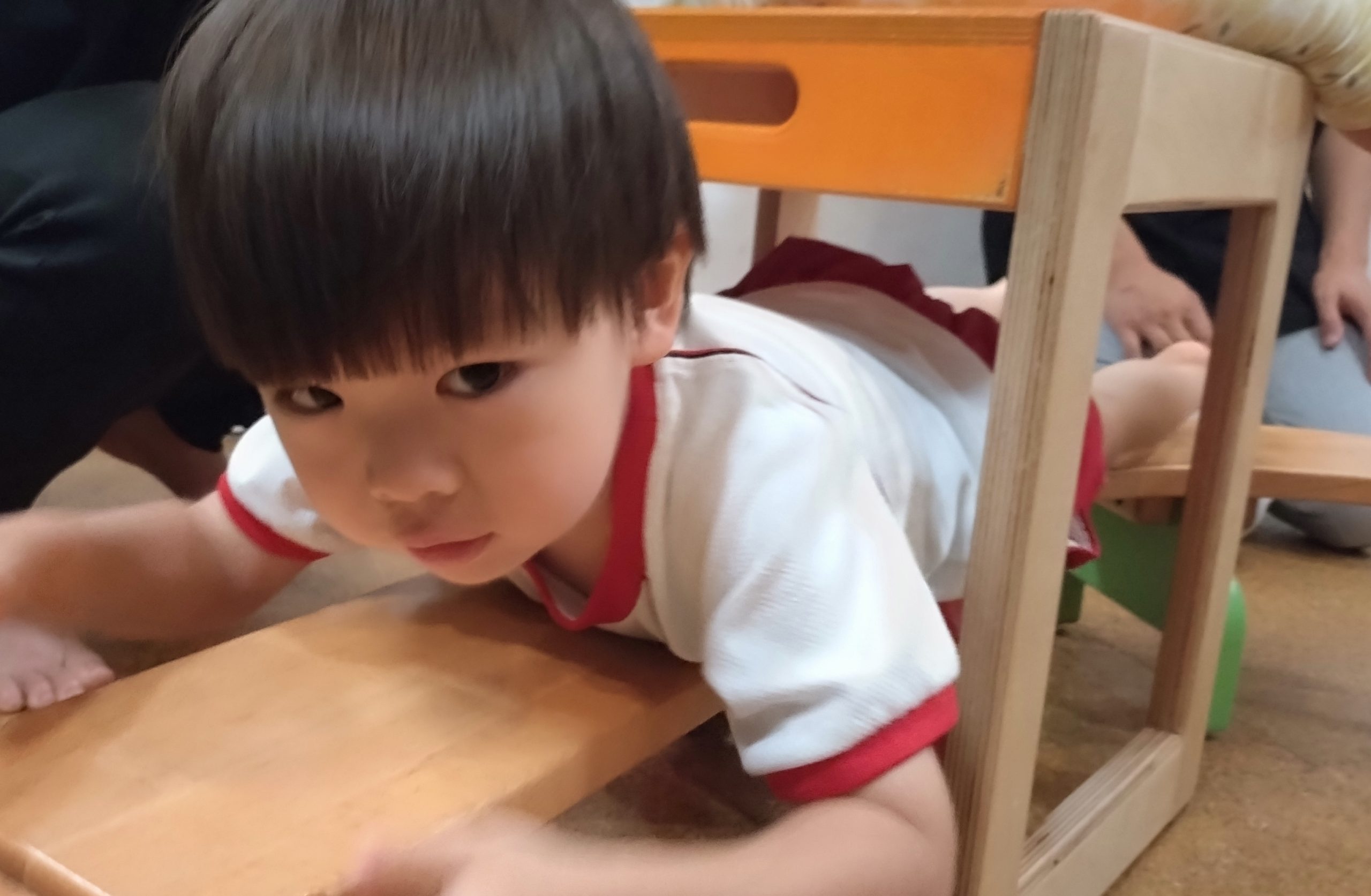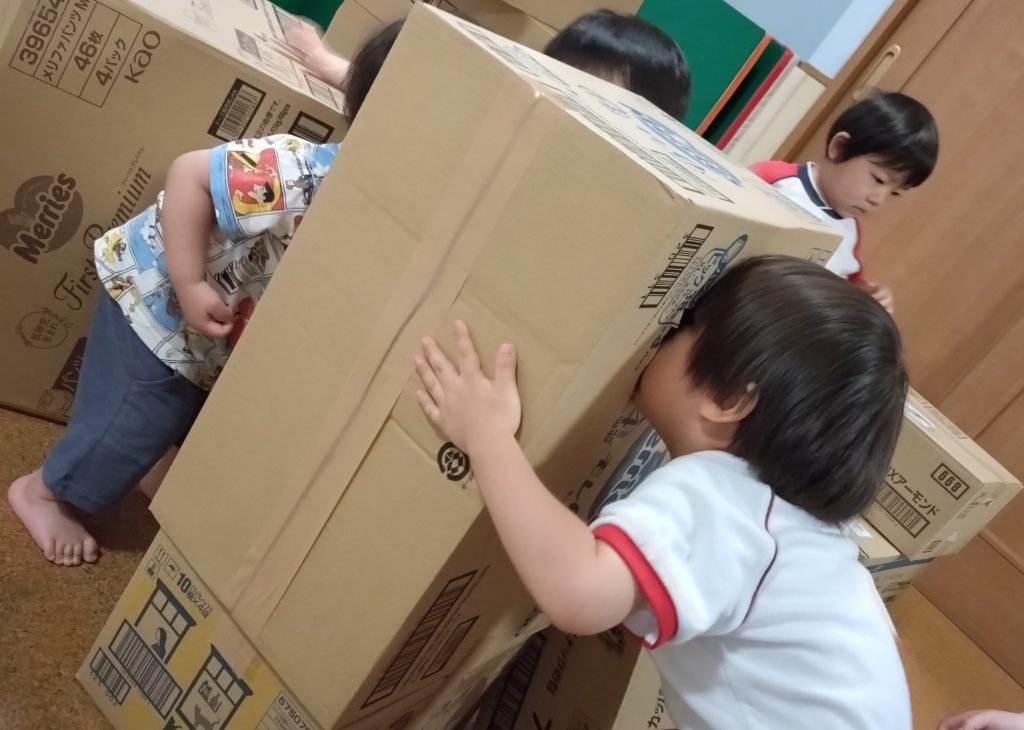 まふぃんで取り組んだことは、まずは遊ぶって面白い!と興味を持てるように遊びを展開したり、遊んでいる友達に興味が向くように遊びへ体を向けたりしました。また、人数に対して遊具の数を調整したりもしました。すると、遊びに向かえる時間が少しずつ増え、特に運動遊びの中でくぐる遊具がとても好きだということが分かりました。子どもの好きや楽しい、ワクワクする気持ちは遊びに向かう原動力になっていきます。好きな遊びからより興味を持って遊べるようにしたいと思い、くぐる遊具を展開すると、様子を伺いながらも友達がいても自分から近づいて入ろうとする姿が見られました。「くぐれたね~すごい!」と声をかけると、にこにこしながら何度も遊具に向かっていました。遠慮しがちなA君も回数を重ねる度、2・3人では遊べるようになりました。そこからより意欲がでてきて沢山の友達がいて遊ぶことができないと顔をしかめて怒る様子も見られました。怒るという感情が出てきたのは、好きや楽しいがより強くなったということ。その感情がもっと楽しい遊びを発見したり、友達の存在や考えに気付けたりするきっかけに繋がります。また、他の人から言われて何となく遊ぶ・する等受け身ではなく、自分の意思をはっきり持てるようになるための成長の途中だと思います。