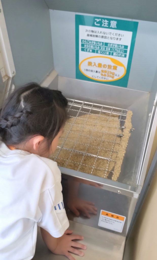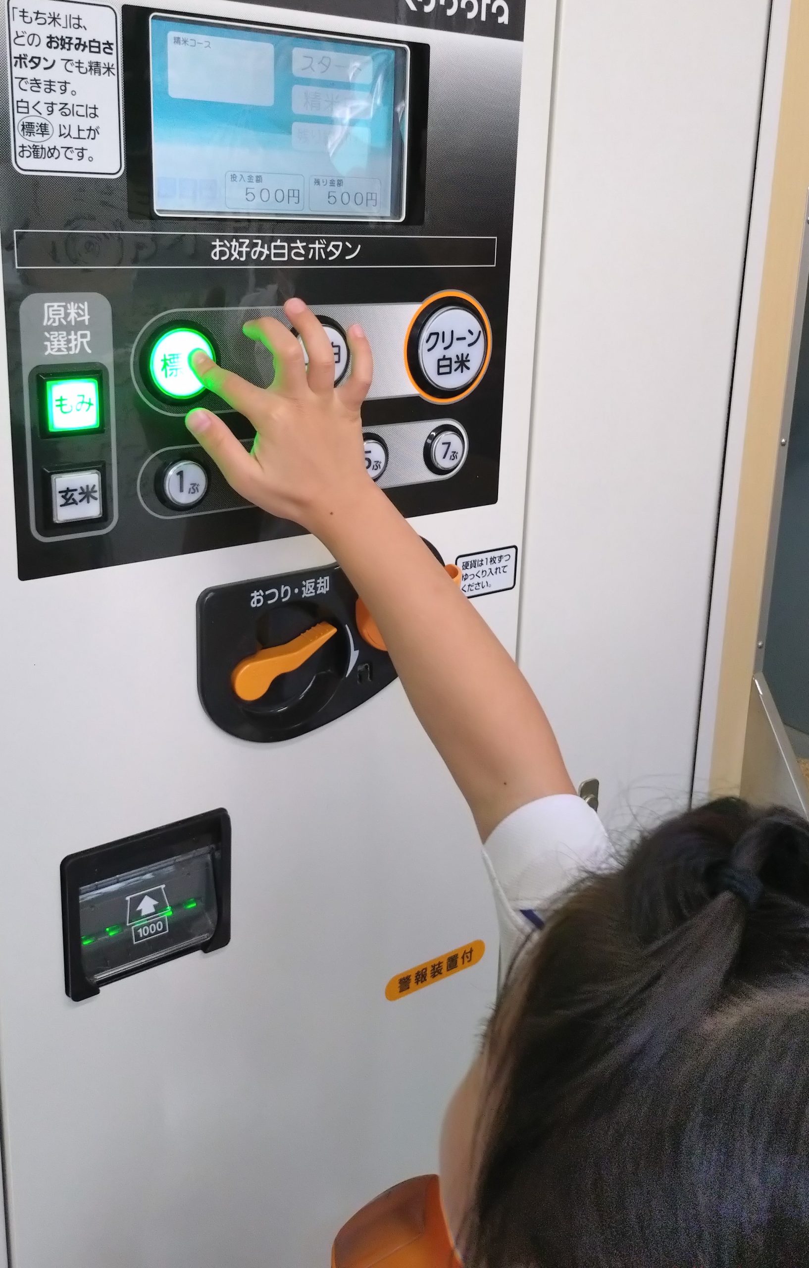 大きな機械の中に籾を入れ、好みの精米度を選びます。七分づき、五分づき、白米といくつか種類があり悩んでいましたが、Aさんは一緒に行ったまふぃん錦ヶ丘のお姉さん達に聞きながらボタンを押しました。