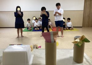 お菓子が付いた的をねらう射的。指定された材料で銃づくりにも挑戦しました。