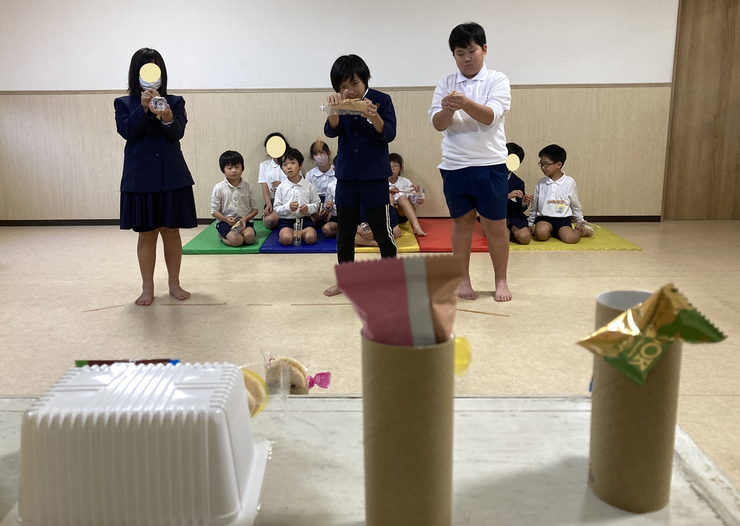 隠されたおやつを見つけ出すおやつミッケ。走り出しそうになった時やお喋りが止まらなくなった時などに声をかけたり行動を止めたりし、その場のルールを守る経験を大切にしました。「しまった…次は気を付けよう」という気付きが、公共の場でマナーを意識する力につながります。