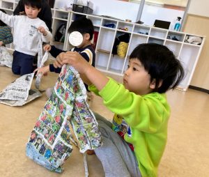 今年度の1年生達の様子を見ると、制服のボタンに苦戦し、涙ぐむ姿が見られました。小学校に入った時、自信を持って取り組めるように、お絵かきなどでスモックを使ったボタンのつけ外しの練習も行っています。また、新聞紙遊びや小麦粉粘土遊び等で、楽しみながら手指の巧緻性を高めていけるように支援しています。