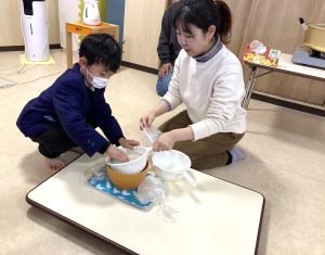 今回の体験はスイッチ一つで電気がつき、蛇口をひねれば綺麗な水が出てくるという日常が当たり前ではないという事を知ってほしいという目的もありました。まふぃんでは日ごろから、子ども達に自分で生きていく為の力をつけてほしいと支援を行っています。その為に「体験的な学び」を大切にしています。体験からの気付きがたくさんの興味関心と「やってみたい」に繋がり、実現させていく中で生きていく力をつけていく。身に付けた力が「もしも」の時に、自分自身だけでなく周りの人の命も守る行動に繋がるといいなと思います。