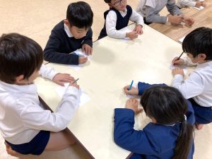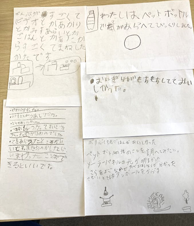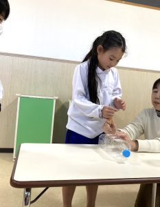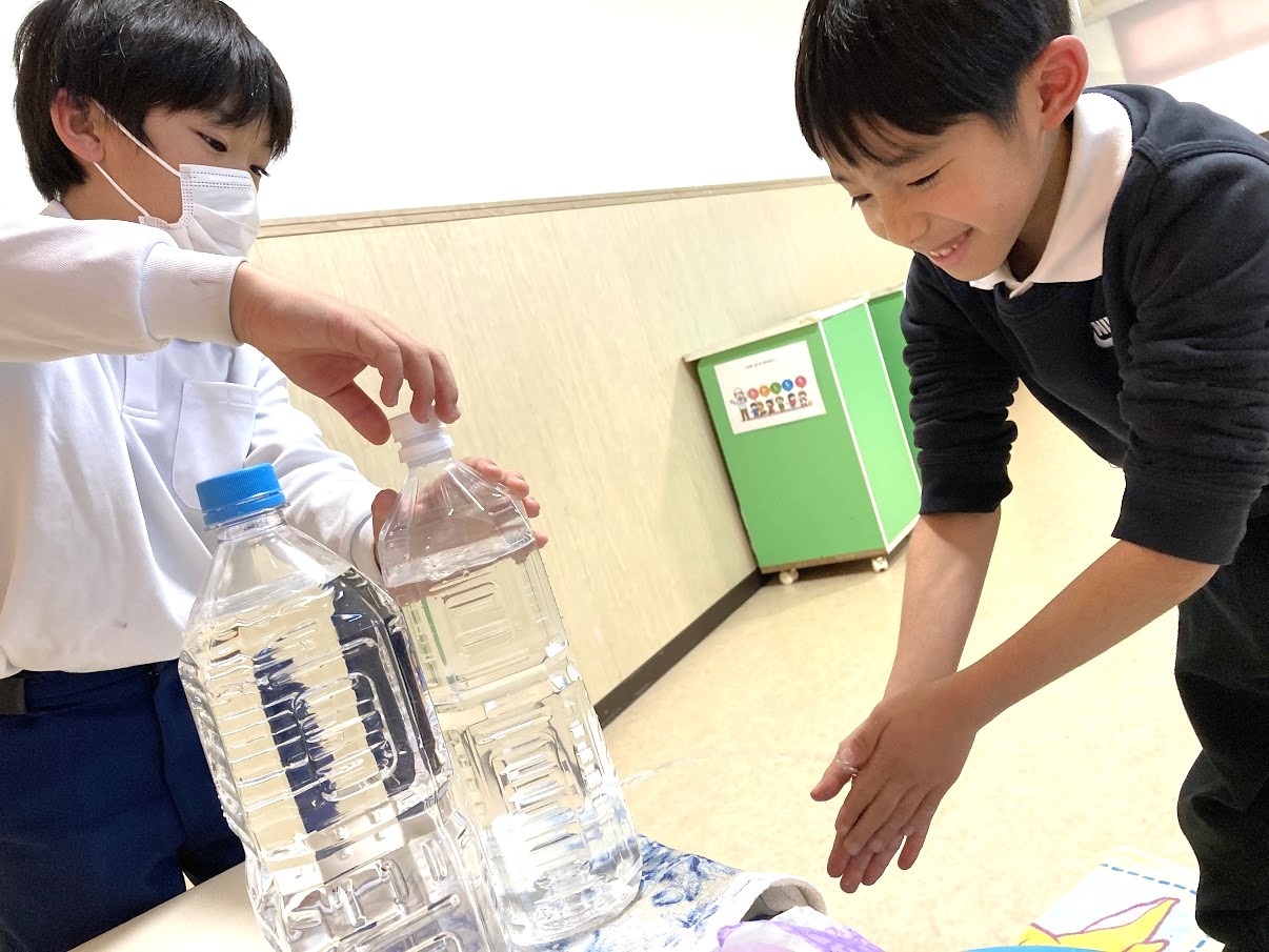 「ペットボトルで手が洗えてビックリ」「今日知ったことを自分でできるといいな」「暖房が使えない時は段ボールを使うといいかも」などの意見が出ました。今回、実際に体験したことで「もしも」をより身近に感じることができたようです。「お水が使えない時、トイレはどうしたらいいの?」という質問も出ました。