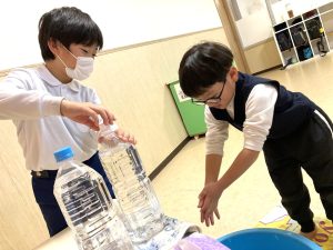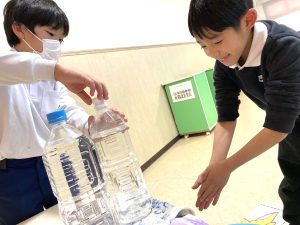 実はペットボトルの水タンクは2本用意していました。しかし子ども達は1本の水を使い切ることなく大切に手洗いをしました。限りある物を皆で大事に使う子ども達の姿がとても嬉しかったです。