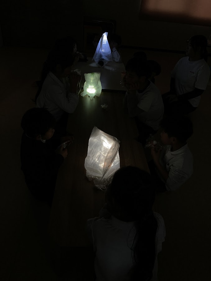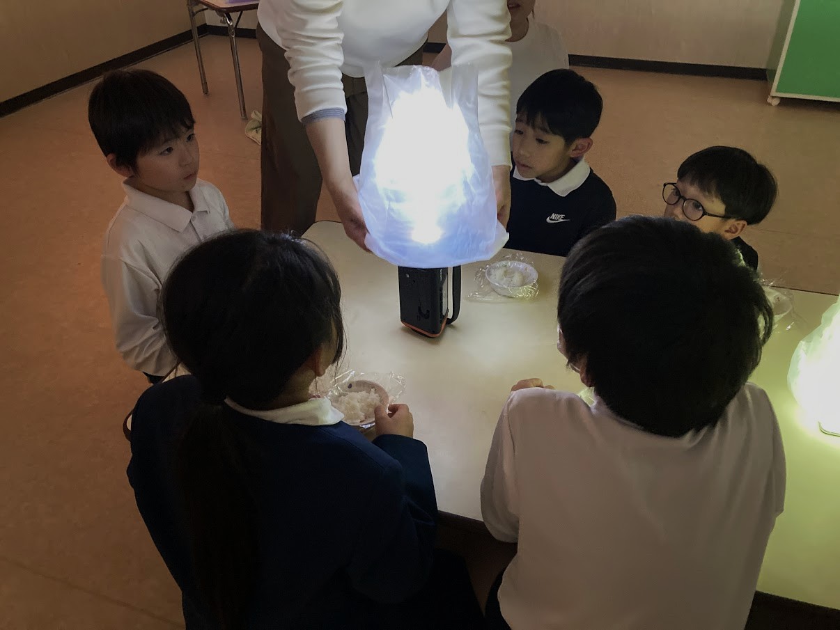 実際に部屋の電気を消してランタンを置くと柔らかい明かりが広がりました。ポリ袋で湯煎したご飯をおやつに皆で「いただきます!」