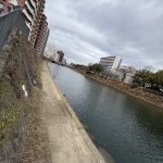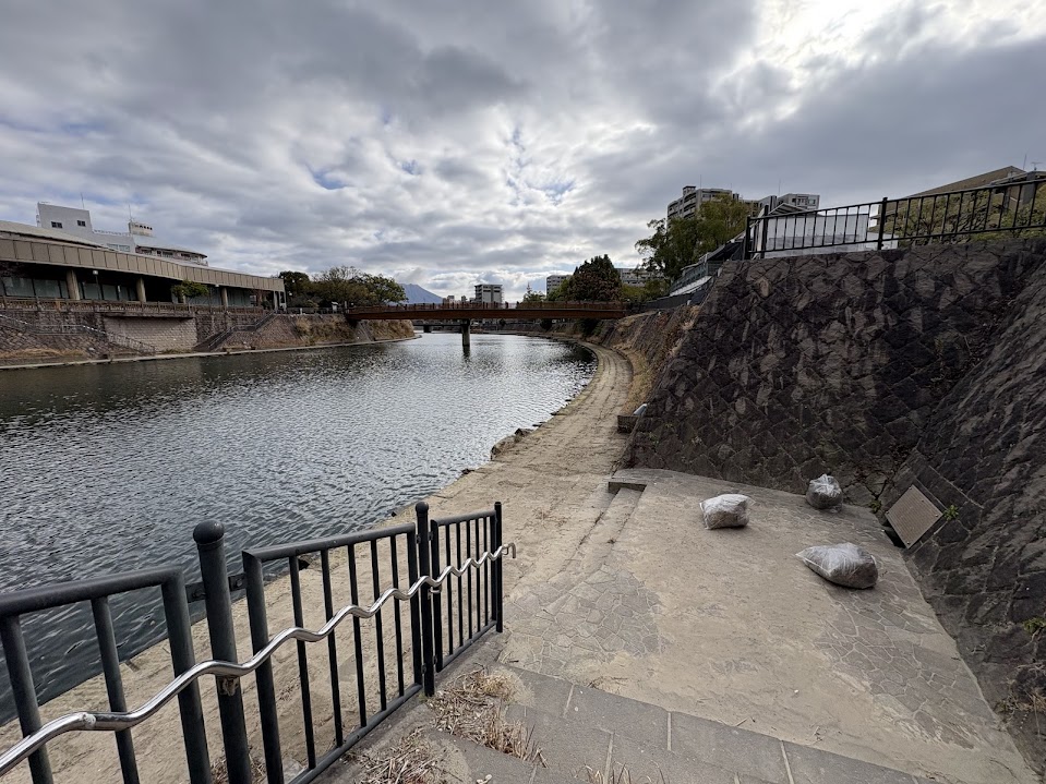 甲突川は川幅が広く、満潮と干潮によって水量に大きな差があり、大雨の際にはさらに水量が増える特徴があります。今回は避難レベル3を想定し、道路沿いに水が逆流する可能性がある状況であったため、まふぃん上階にあるナガヤタワーへ避難することとしました。